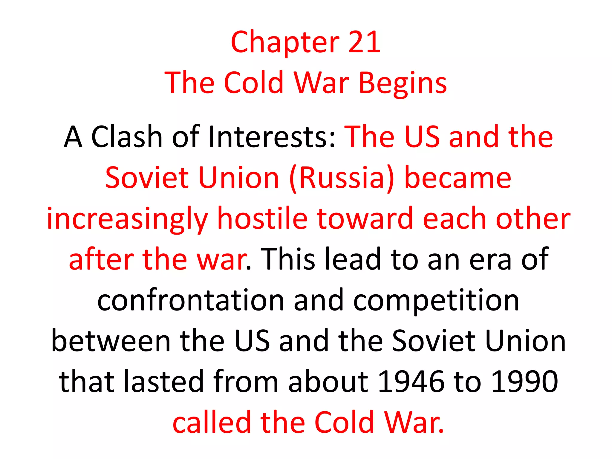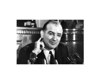 The Cold War began after WWII as tensions grew between the US and Soviet Union due to their differing goals of security and democracy. This led to an era of confrontation as the two nations competed for influence in Europe and other parts of the world. The tensions were exacerbated by events like the Soviet takeover of Eastern Europe, the Berlin Blockade, the creation of NATO, and China becoming communist. The Korean War further heightened fears of communism's spread. During this early Cold War period, the Red Scare led to widespread paranoia in the US regarding communist infiltration.