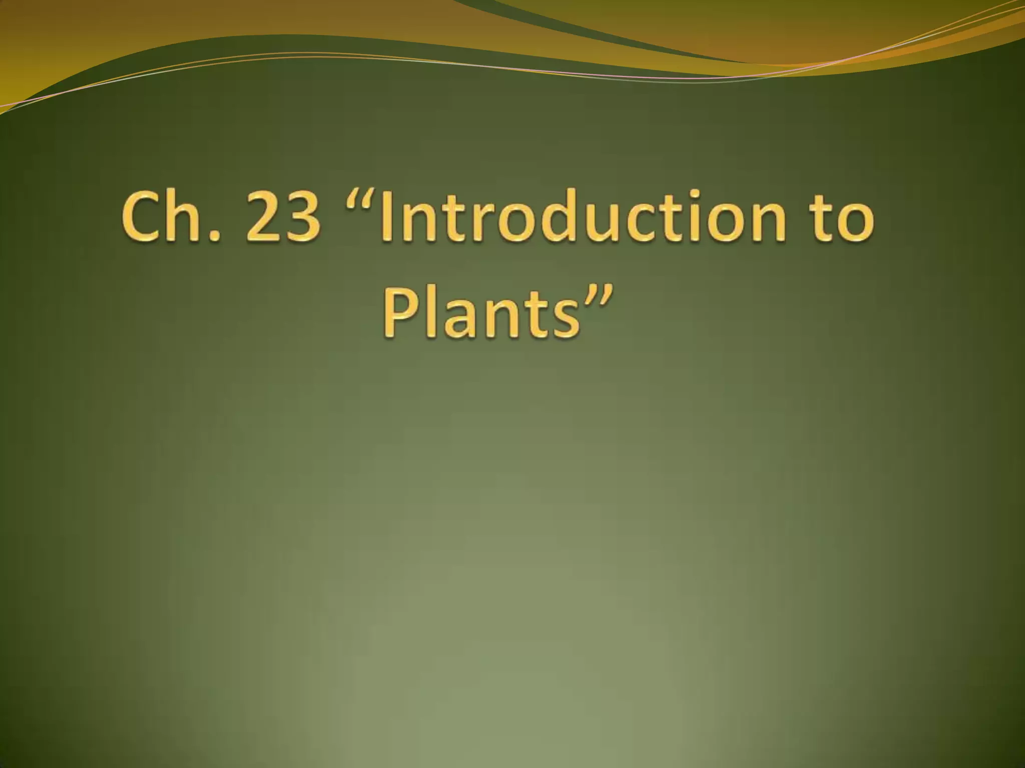 Plants evolved adaptations to survive on land such as developing a waxy cuticle, stomata, and guard cells to regulate water loss. They also evolved vascular tissues to transport water and nutrients, seeds to reproduce, and flowers to attract pollinators. There are four main kinds of plants - nonvascular which rely on water, seedless vascular with spores, gymnosperms with naked seeds, and angiosperms which produce flowers and fruits enclosing seeds. Angiosperms are further divided into monocots and dicots. Plants provide essential resources like food, wood, medicines, and fibers and have cellular structures like chloroplasts and vacuoles that allow them to survive on land.