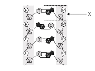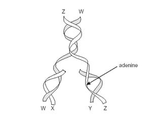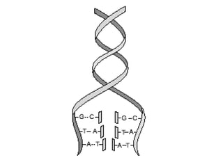 The document describes the chemical makeup and structure of DNA and RNA. It also explains the processes of DNA replication, transcription, translation, and protein synthesis. DNA is made up of nucleotides containing deoxyribose, phosphate and one of four nitrogenous bases (A, T, C, G). RNA also contains nucleotides but with ribose instead of deoxyribose and uracil replacing thymine. DNA replication involves unwinding the DNA double helix, complementary base pairing between nucleotides, and joining of the new DNA strands. Transcription and translation are required to produce proteins. Transcription copies DNA into mRNA which is then read by ribosomes during translation, where tRNA brings amino acids to be joined into polypeptides based