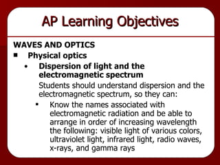 This document provides an overview of electromagnetic waves and key concepts in physics including: