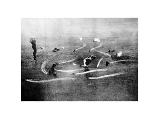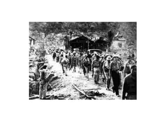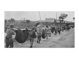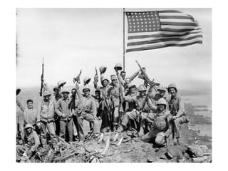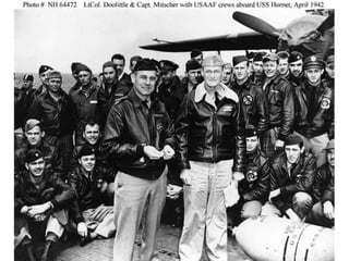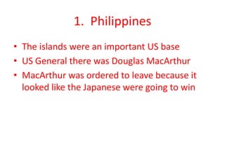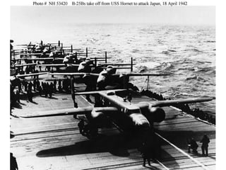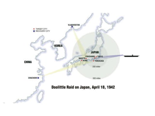The Philippines were an important US base until the Japanese forced the surrender of US forces in April 1942. This led to the infamous Bataan Death March where thousands of Filipino and US prisoners of war died. In the Pacific Theater, the Doolittle Raid on Tokyo and the Battles of the Coral Sea and Midway turned the tide in favor of the US by stopping Japanese naval advances. The US also fought major battles to take Iwo Jima and Okinawa to reach the Japanese mainland. Meanwhile, the Manhattan Project developed the atomic bomb which the US dropped on Hiroshima and Nagasaki in August 1945 after Japan refused to surrender, leading to their surrender and the end of the war.