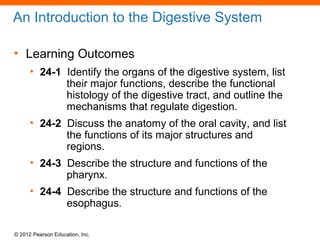 This document provides an overview of the digestive system and its organs. It begins by listing the learning outcomes, which cover the anatomy and functions of the oral cavity, pharynx, esophagus, stomach, small intestine, large intestine, and accessory organs. It then describes the six main functions of the digestive system and the histological layers of the digestive tract. Finally, it discusses the mesenteries that support the digestive organs and how the enteric nervous system regulates digestion.