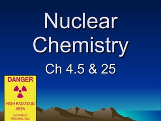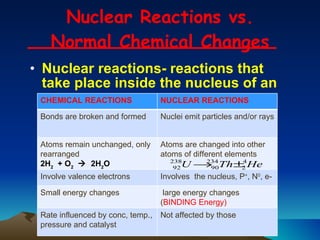 Nuclear reactions involve changes to atomic nuclei, whereas chemical reactions only involve rearrangement of electrons. Nuclear reactions can release large amounts of energy and produce new elements, while chemical reactions typically involve smaller energy changes and atoms remain the same elements. Radioactive decay is an example of a nuclear reaction where an unstable atomic nucleus spontaneously transforms into a more stable nucleus by emitting particles or electromagnetic radiation.