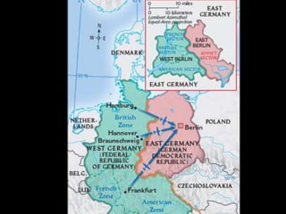 The Cold War began after World War II as tensions grew between the Soviet Union and the United States, who emerged as rival superpowers with opposing ideologies. Over the following decades, their rivalry dominated global politics and led to military conflicts and alliances around the world as each sought to expand their influence. Key events included the formation of NATO, the Soviet blockade of Berlin, the Korean War, the Cuban Missile Crisis, and the Vietnam War, as the two powers confronted each other indirectly through proxy wars. The Cold War lasted over 40 years until the decline and collapse of the Soviet Union in the late 1980s.