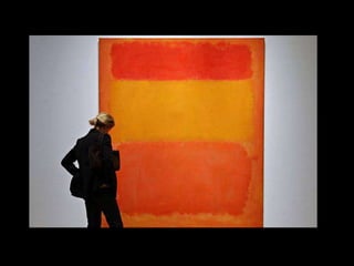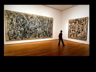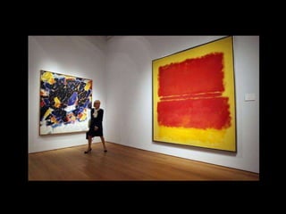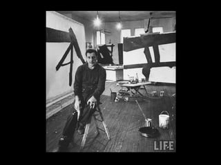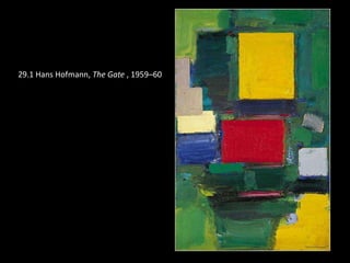 The document discusses key aspects of abstract expressionism including its focus in New York City, important artists and artworks, and the influence of Clement Greenberg. It provides details on action painting developed by Jackson Pollock and the two types of abstract expressionism. Key figures mentioned include Hans Hofmann, Josef Albers, Arshile Gorky, Jackson Pollock, Franz Kline, Willem de Kooning, Mark Rothko, Helen Frankenthaler, Frank Stella, Ellsworth Kelly, Richard Diebenkorn, Isamu Noguchi, David Smith, and Louise Nevelson.