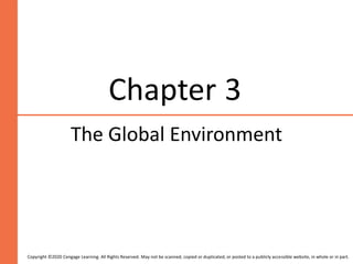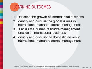 The document outlines learning outcomes and topics for a chapter on the global environment of international human resource management. It discusses 6 learning outcomes, including describing the growth of international business and issues in international HRM, labor relations, and managing international transfers. Specific topics covered include the historical growth of global business since World War 2, cultural and political factors affecting HRM strategy, challenges in international business management, and selecting and assessing expatriates for international assignments.