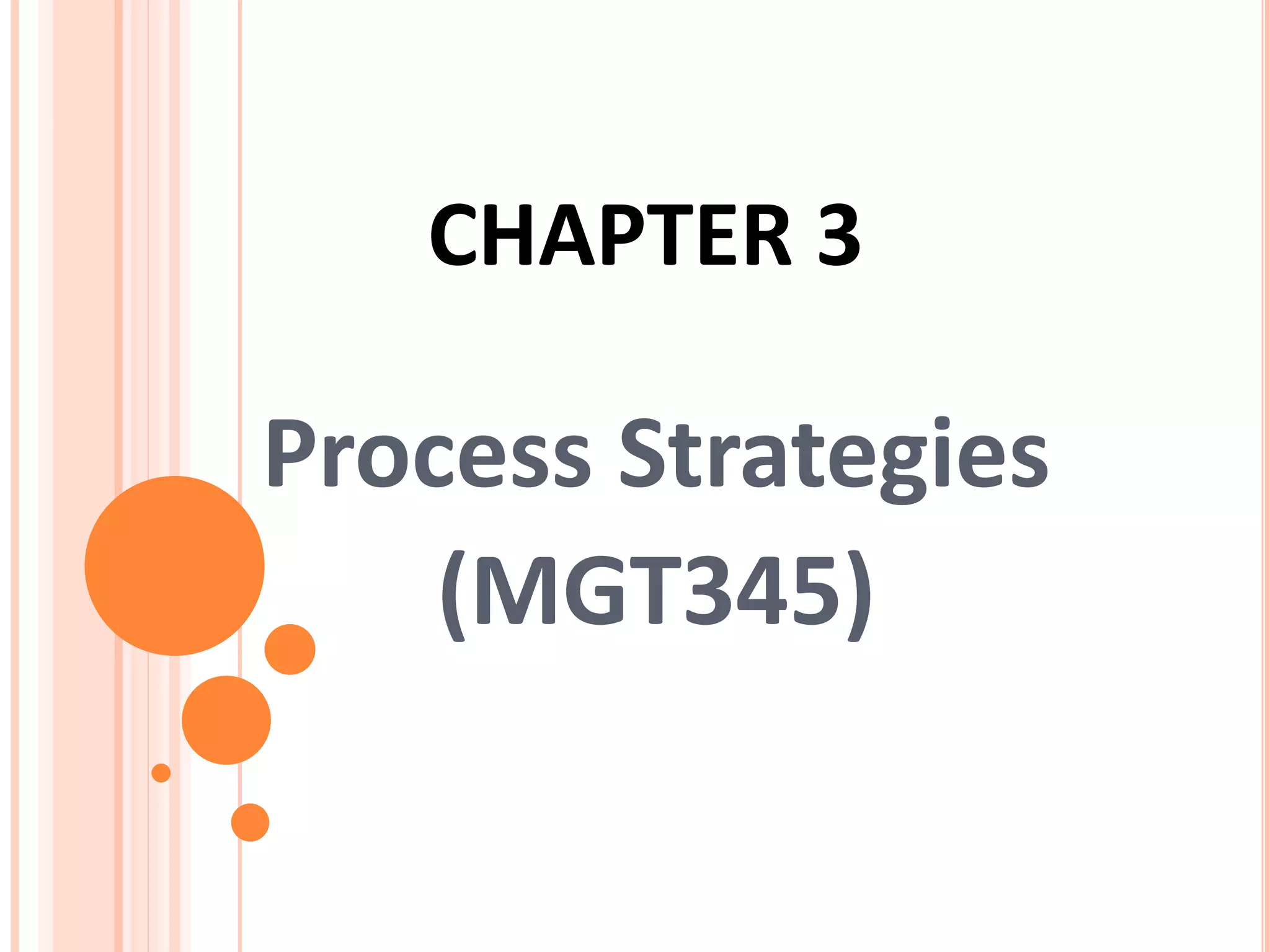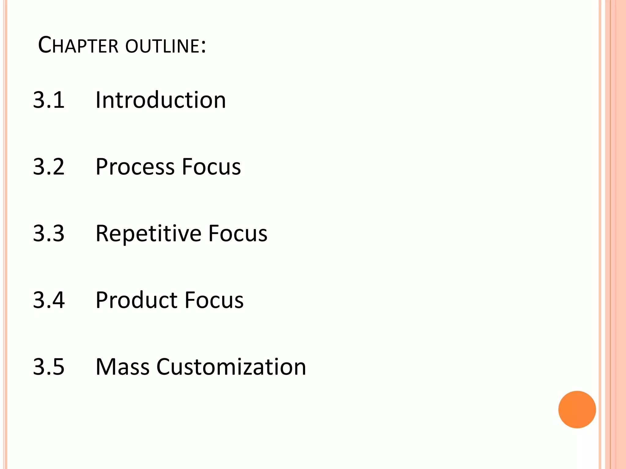 This document discusses different process strategies including process focus, repetitive focus, product focus, and mass customization. Process focus involves producing a high variety of products in low volumes using general purpose equipment. Repetitive focus uses specialized equipment and assembly lines for standardized, high volume production. Product focus is for very high volumes of standardized products using continuous, specialized automation. Mass customization combines flexibility and efficiency to produce high volumes of customized products.