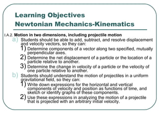 This document provides a summary of key concepts in two-dimensional kinematics and projectile motion. It begins by defining displacement, velocity, and acceleration in two dimensions. It then discusses solving kinematics problems by resolving vectors into horizontal and vertical components. The document also covers projectile motion, where the horizontal velocity is constant and vertical acceleration is due to gravity. It ends by discussing relative velocity problems involving adding velocities of objects moving relative to each other or to a fixed point.