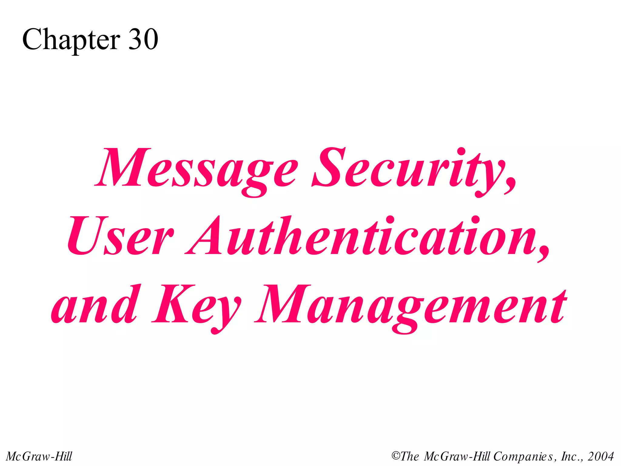 This document discusses message security, user authentication, and key management. It covers digital signatures, symmetric and asymmetric encryption, authentication using keys or nonces, key distribution methods like Diffie-Hellman, and public key infrastructure including the X.500 standard and certificate fields. Kerberos is introduced as a network authentication system using ticket-granting servers. Diagrams illustrate privacy, signatures, authentication approaches, man-in-the-middle attacks, key distribution centers, and the Kerberos process.