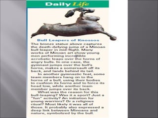 The Minoans dominated trade in the Mediterranean Sea from 2000-1400 BC with their advanced civilization based on the island of Crete. They traded their high quality pottery, spreading their culture and influencing future Greeks. Natural disasters around 1200 BC may have weakened the Minoans and allowed Greek invaders to attack. The Phoenicians then dominated Mediterranean trade from 1100 BC, operating out of cities like Sidon and Tyre in present-day Lebanon. They developed the first alphabetic writing system which was adopted by the Greeks and became the basis for modern alphabets like English.