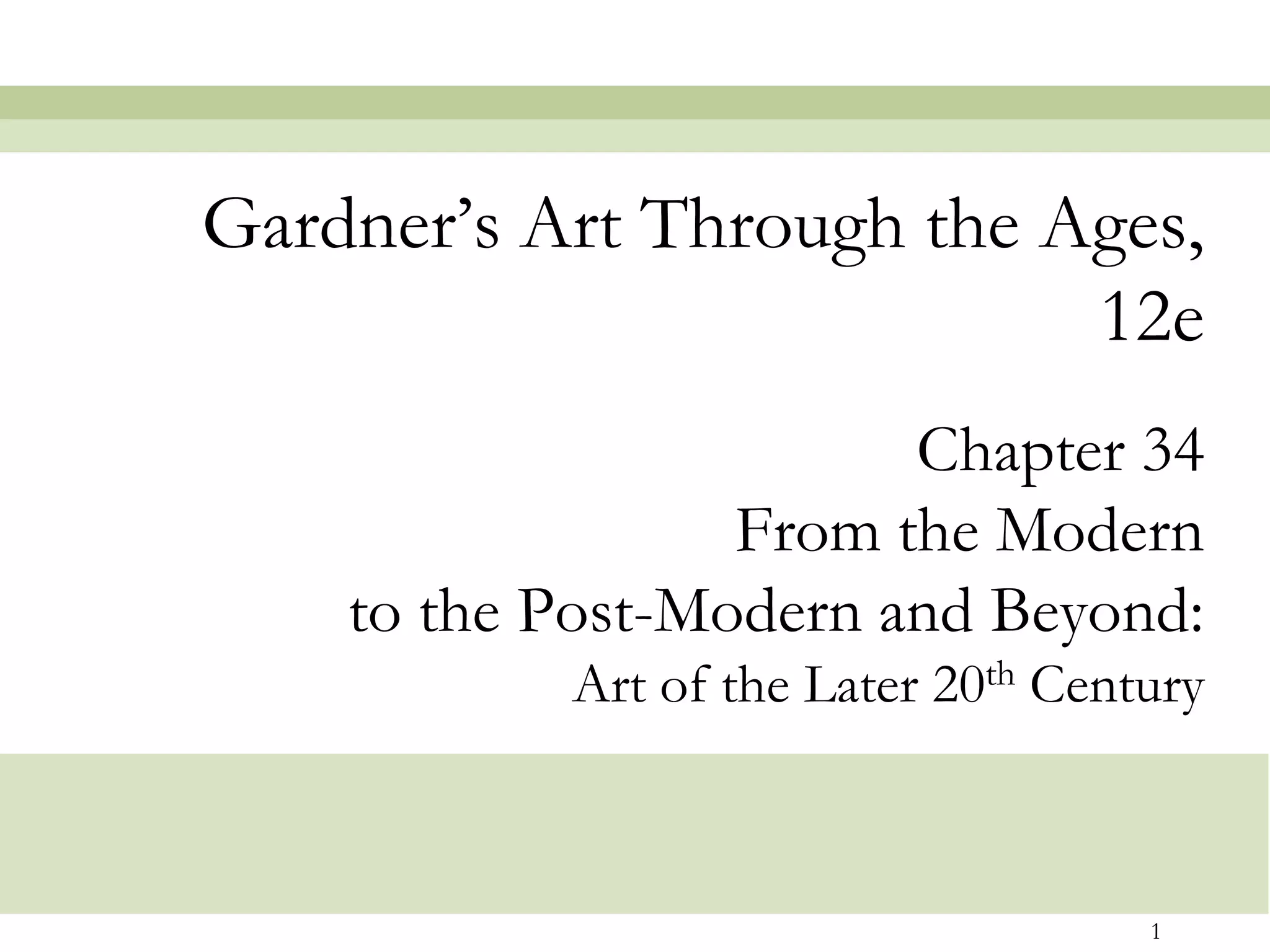This document provides an overview of art from the modern to postmodern eras in the later 20th century. It discusses how World War 2 shifted the center of western art from Paris to New York. Modernist styles like abstract expressionism, minimalism, and conceptual art are examined. The document also explores postmodern reactions like pop art, earthworks, and new organic architectures. Key artists and their representative works from each movement are illustrated to understand the theories and styles and critique of modernism in late 20th century art.