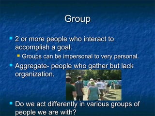 Groups are made up of 2 or more people who interact to accomplish a goal. Groups can range from impersonal aggregates of people who lack organization, to very personal primary groups with intimate, long-term relationships. The way groups work depends on factors like the amount of time spent together, level of organization, and size of the group. Groups are also influenced by social categories people are classified into based on shared traits, as well as in-groups and out-groups people identify or do not identify with.