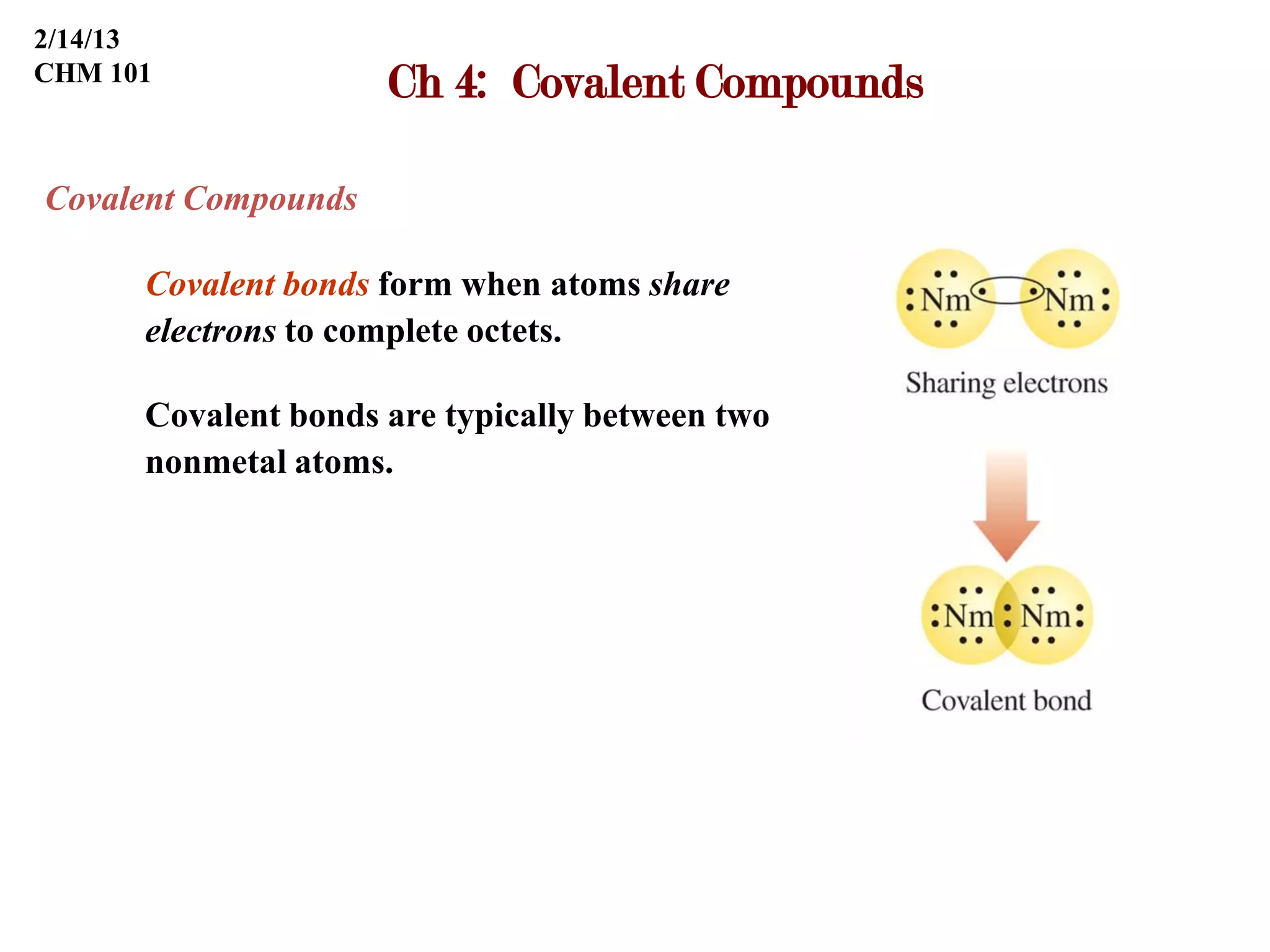 Covalent bonds form when atoms share electrons to complete their outer electron shells. Covalent compounds are typically made of nonmetal atoms. Binary covalent compounds contain only two elements. Their names follow specific rules based on element position in the periodic table. Molecular shape is determined by VSEPR theory, which predicts the geometry that minimizes electron pair repulsions. Polar covalent bonds result from unequal electron sharing between atoms of different electronegativity. Molecular polarity depends on both bond polarity and molecular geometry.