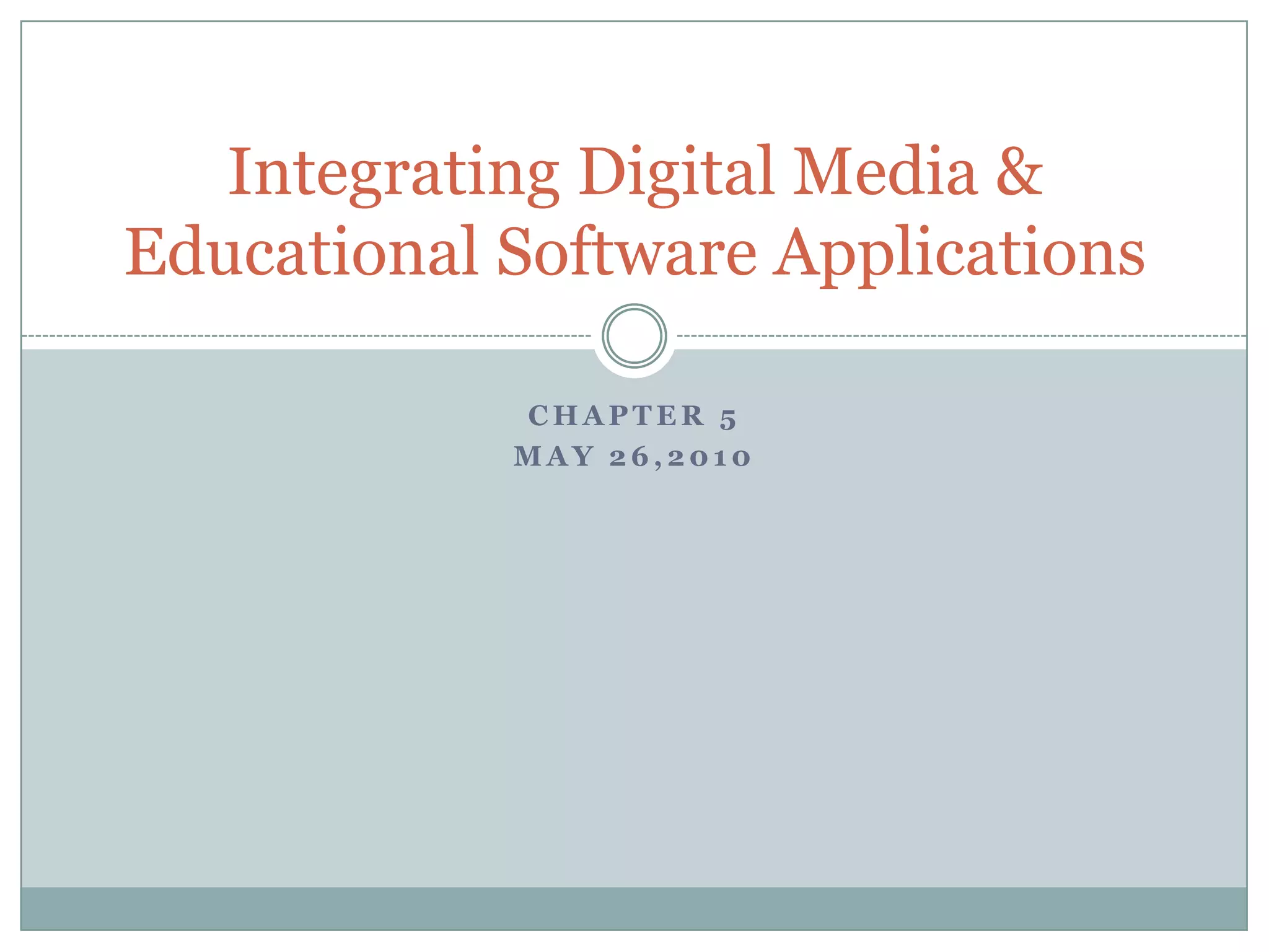 Digital media allows for interactive and individualized learning experiences by incorporating multimedia elements like text, graphics, audio, video and animation. Students can use digital media tools to explore virtual environments and learn at their own pace. Common digital media applications include simulations, e-books, virtual reality, drill and practice software, and distance learning programs that integrate online and in-person instruction. Educators are increasingly using digital media tools like tutorials, presentations, and integrated learning systems to enrich classroom experiences.