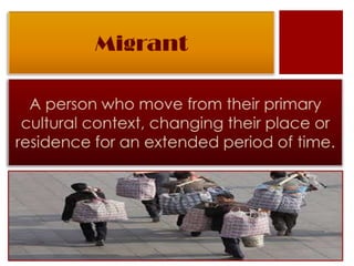 This chapter discusses intercultural adaptation in the context of globalization and migration. It introduces a multi-level framework to analyze adaptation at the micro, meso, and macro levels. At the macro level, theories include push-pull, world systems theory, melting pot, and pluralism. Micro theories examine migrant-host relationships through assimilation, separation, integration, and intercultural transformation. Meso theories analyze migrant networks and social capital. The chapter also explores the challenges of modern migration and the four types of migrant groups.