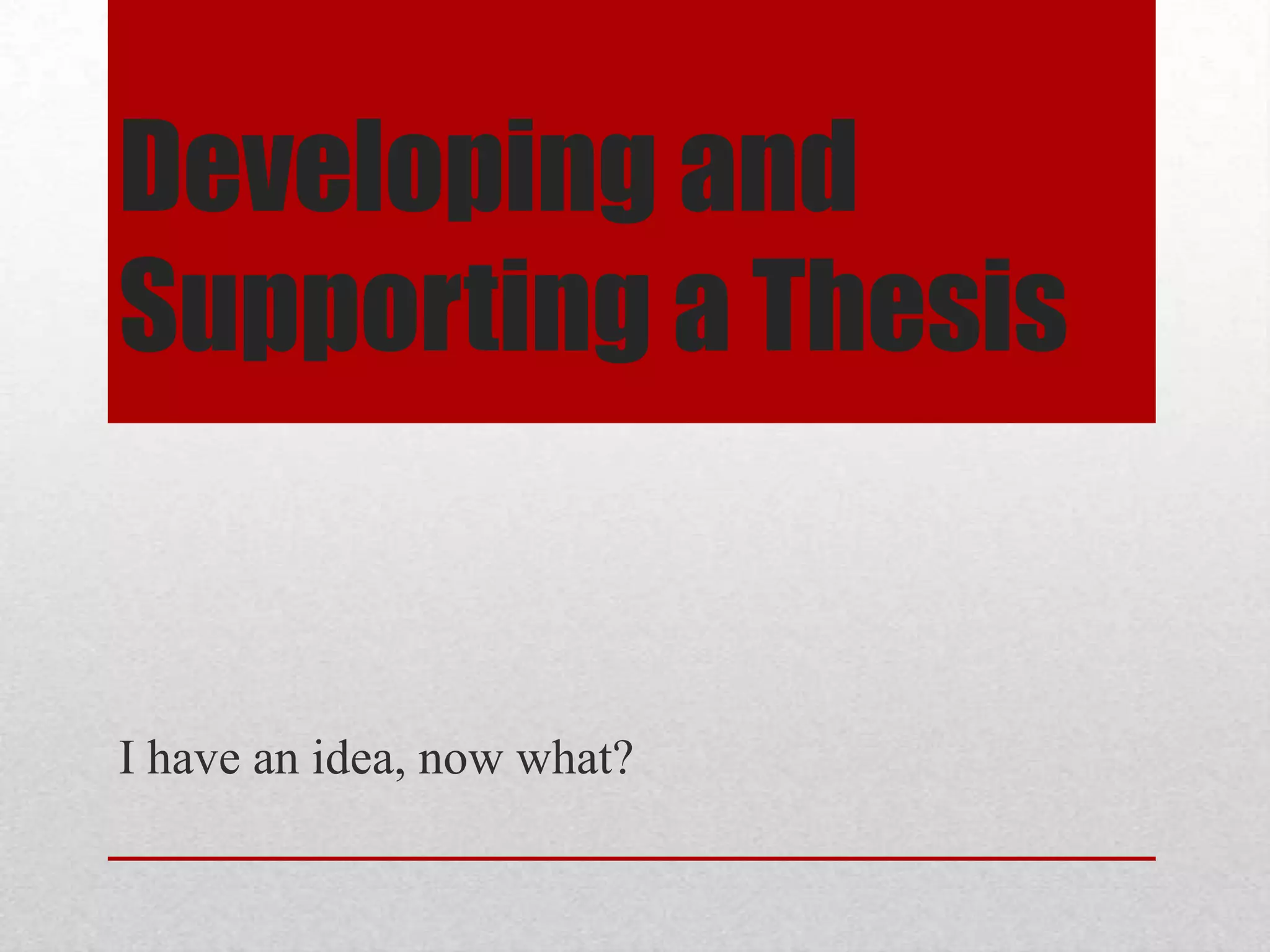 This document provides guidance on developing and supporting a thesis statement. It defines a thesis statement as the central idea or position of an essay that explains what the essay will be about. The document recommends starting with prewriting to come up with an idea, then formulating a working thesis and refining it to be specific, focused on one central point, and original. It stresses using evidence such as examples, statistics, and expert opinions to support the thesis. The document also provides tips on choosing the best evidence, placing the thesis, and citing sources to academically support the thesis.