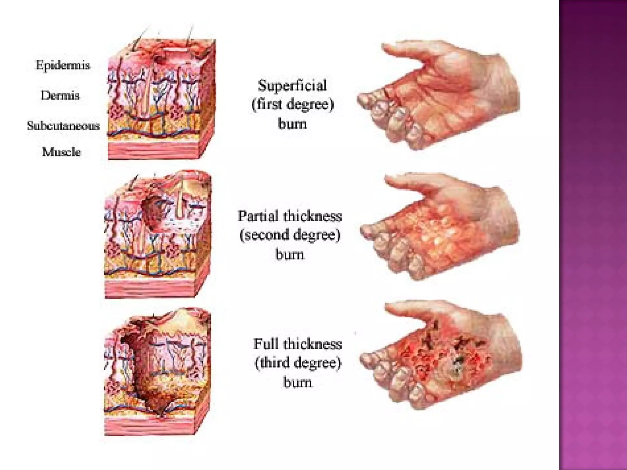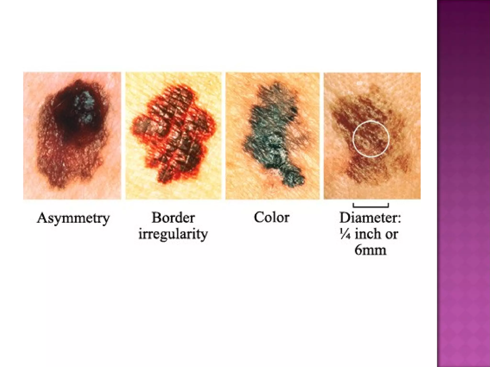 The document discusses different types of skin cancers affecting 1 in 5 Americans, including basal cell carcinoma, squamous cell carcinoma, and melanoma, detailing their characteristics and treatment methods. It also outlines the dangers of burns, including types and their effects on the body, and provides insight into skin development from infancy to old age. Key factors for recognizing melanoma include asymmetry, border irregularity, color variation, diameter, and elevation.