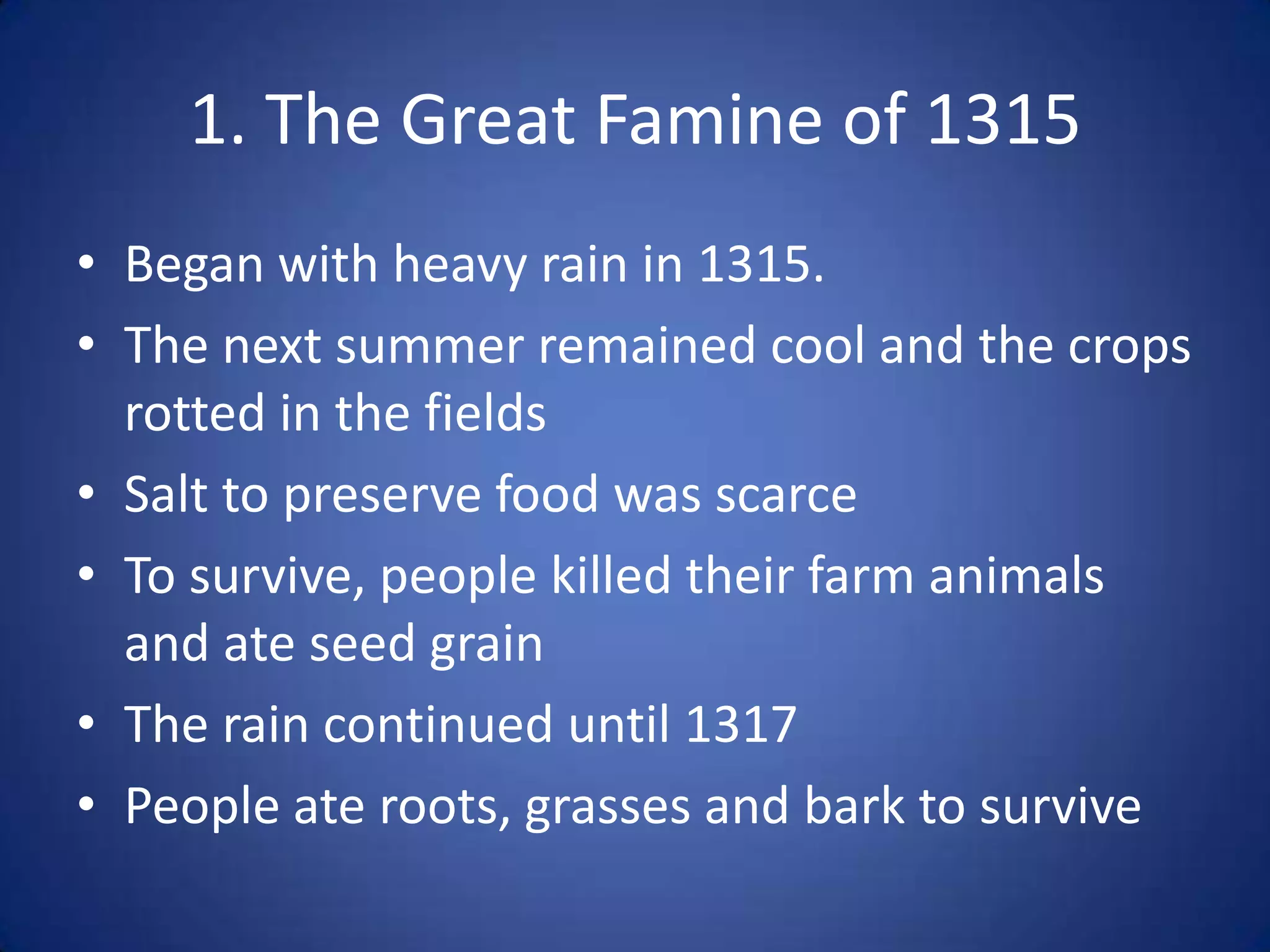 1. The Great Famine of 1315-1317 which began with heavy rain and cool summers that caused crops to rot. People survived by eating roots, bark and their farm animals, leading to long term weakness and 25% death toll.
