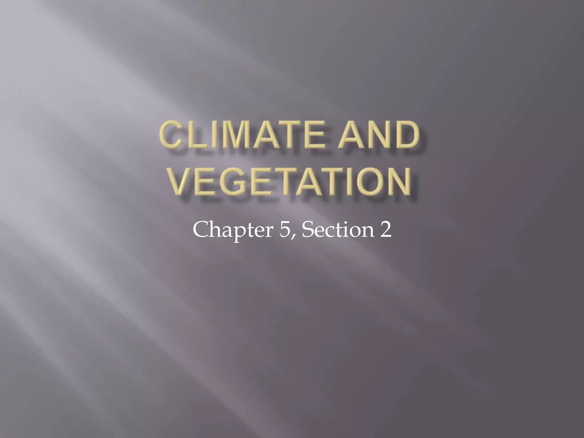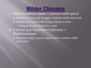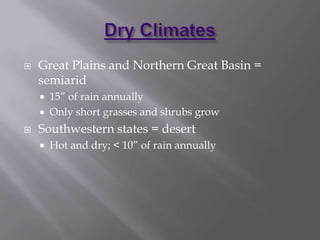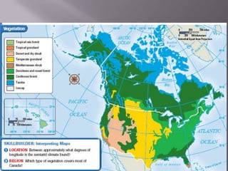 This document discusses climate zones and vegetation in North America. It describes several climate zones including tundra, subarctic, humid continental, marine west coast, humid subtropical, and Mediterranean. It notes temperature and precipitation patterns as well as typical vegetation for each zone. The document also discusses how human-environment interaction has changed over time as people migrated across North America and built cities, trails, waterways, railroads, and highway systems.