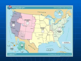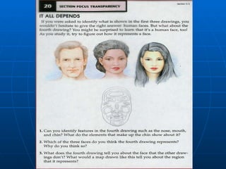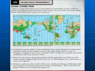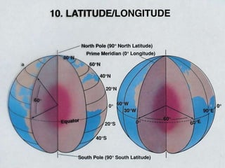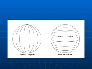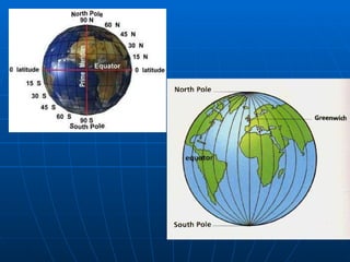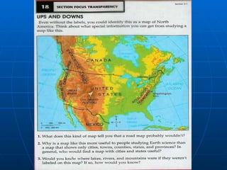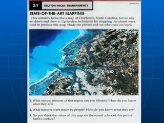 The document provides an overview of landforms, views of Earth, and mapping techniques. It discusses the three main landforms - plains, plateaus, and mountains - and how each forms. It then covers latitude and longitude for determining locations, global time zones, and types of map projections like Mercator and topographic maps using contour lines. Finally, it discusses remote sensing techniques from satellites and underwater to map and study Earth's surface and oceans.