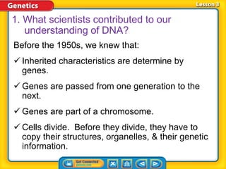 Rosalind Franklin, Maurice Wilkins, and Erwin Chargaff contributed to understanding DNA structure through X-ray diffraction and composition studies. James Watson and Francis Crick determined that DNA has a double helix structure with adenine bonding with thymine and cytosine bonding with guanine. DNA replication is the process where the DNA double helix unwinds and each strand acts as a template to produce two identical DNA molecules. Mutations can occur through insertion, deletion, or substitution of DNA bases and can affect organism traits, sometimes beneficially through increased disease resistance.