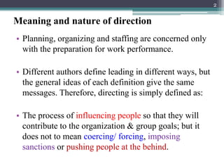 The document discusses the nature of leadership and directing in management, defining directing as the process of influencing individuals to achieve organizational goals through leadership, motivation, and communication. It outlines various leadership theories and styles, emphasizing that effective leadership can be learned and adapted to situations, while also distinguishing leadership from management. Additionally, the document covers motivation, its characteristics, types, and theories, including Maslow's hierarchy of needs and Herzberg's two-factor theory.