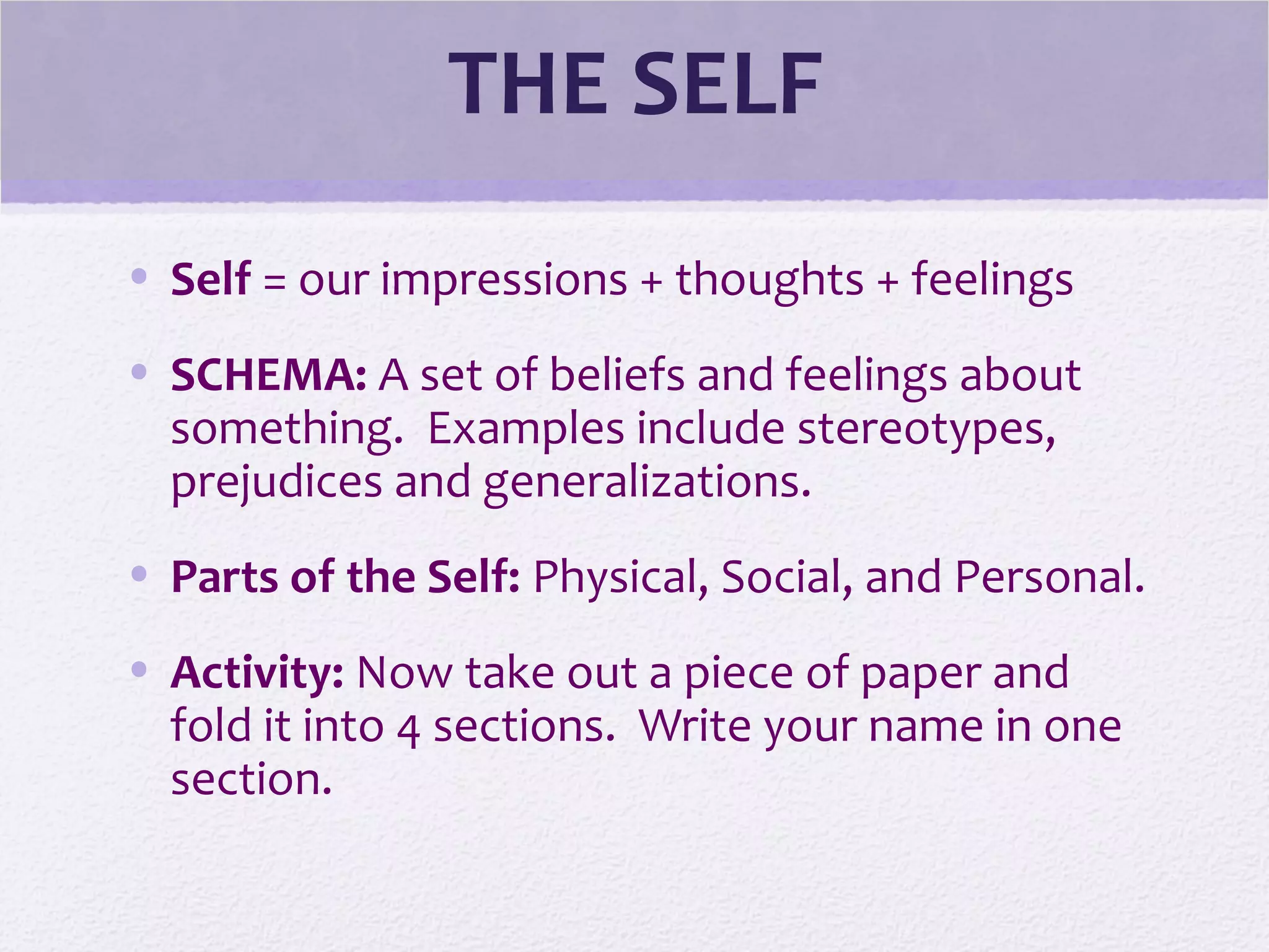 This document summarizes key aspects of the self, including the physical self, social self, and personal self. It discusses self-concept, self-esteem, and ideal self. It also covers social perception and formation of impressions of others, including the influence of body language, stereotypes, prejudice, and attribution theory. Identity development is discussed, including identity statuses and challenges that may be faced by those from minority groups.