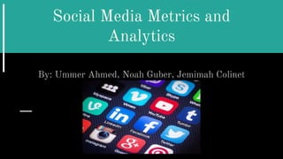 This document discusses social media metrics and analytics. It describes various ways to measure engagement on platforms like Facebook, Twitter, and Google Analytics. Metrics include number of likes, shares, comments, followers, and keyword searches. The document also discusses social network analysis and visualization of networks through graphs. Measuring influence, popularity, engagement, and trust on Twitter is discussed using the example of TweetLevel.com scores. Network theory concepts like communities and sociograms are also covered.