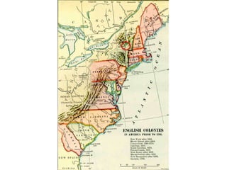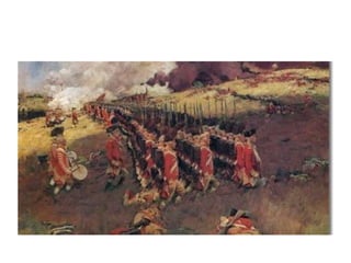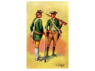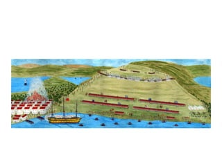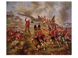 The document summarizes key events during the lead up to American independence, including the Second Continental Congress forming an army under George Washington, the British passing the Prohibitory Act to cut off trade, and Ethan Allen and the Green Mountain Boys capturing Fort Ticonderoga without firing a shot. It also discusses the Battles of Bunker Hill where the British attacked three times before the Americans ran out of ammunition and retreated, after which Britain hired Hessian mercenaries to aid their war effort. Finally, it mentions Henry Knox hauling cannons from Fort Ticonderoga to use against the British in Boston, forcing their retreat from the city.