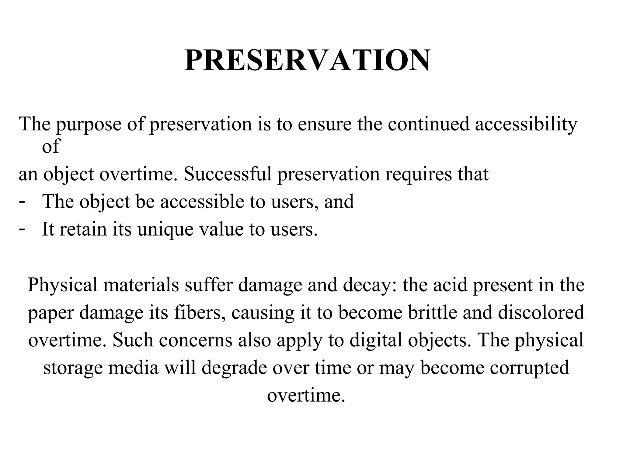 The purpose of digital preservation is to ensure continued access to digital objects over time as technologies change. This requires both passive preservation through secure storage and active preservation such as migration to new file formats or emulation. Characterization, planning, and action are important steps in the preservation process. Tools like PRONOM, LOCKSS, EPrints, and DSpace can help with various aspects of passive and active preservation. The National Library of Korea's OASIS system collects and preserves Korean digital resources through workflows that involve selective collection, processing, metadata, and long-term preservation.
