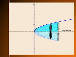 1. The document discusses several methods for calculating the volume of solids of revolution, including slicing, disk, washer, and specific examples of their use.