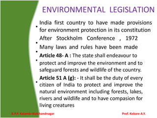 The document discusses environmental protection in India, highlighting constitutional provisions and various environmental laws such as the Wildlife Protection Act, Water Act, and the Environment Protection Act. It emphasizes the ethical responsibility of individuals and the state to protect the environment, including air, water, and land, while outlining regulations and penalties for violations. The importance of sustainable practices and eco-centric views for maintaining ecological balance is also addressed.