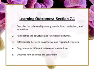 This document provides information about microbial metabolism and enzymes. It begins with learning outcomes about metabolism, enzymes, and metabolic pathways. It then defines metabolism as all chemical reactions in the cell, and defines anabolism as building reactions that require energy, and catabolism as energy-releasing breakdown reactions. Enzymes are described as catalysts with specific active sites that lower reaction activation energy. Regulation of enzymes through feedback inhibition or induction in response to substrates is covered. Electron carriers like NADH and FAD that facilitate energy transfer in redox reactions are also discussed. ATP is described as the main energy currency molecule in cells.