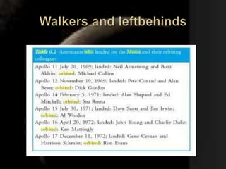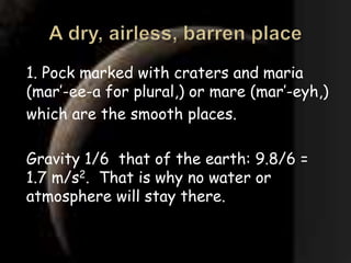 1. The Moon has many craters and smooth areas called maria. Its gravity is 1/6 that of Earth, so it cannot retain water or atmosphere.