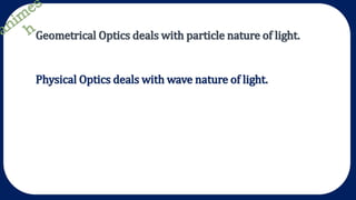 1. Physical Optics deals with the wave nature of light, specifically electromagnetic waves described by Maxwell's equations, whereas Geometrical Optics deals with the particle nature of light.