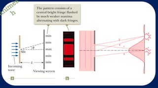 3. Interference and diffraction of light can be explained using Huygens' principle that each point on a wavefront acts as a secondary source emitting spherical wavelets. This allows prediction of phenomena like interference patterns, reflection and refraction of light.