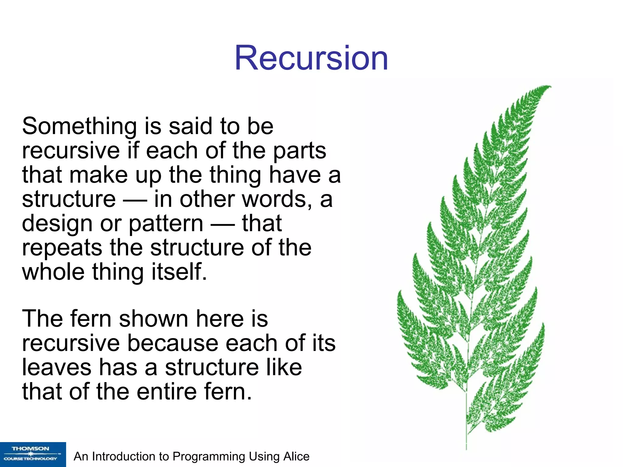 Recursion involves a method that calls itself directly or indirectly. This can be done linearly, where a method calls itself once, or exponentially, where it calls itself multiple times. Recursive algorithms can generate complex structures from simple instructions and are often more efficient than iterative approaches, though they require additional memory. Common examples of recursion in nature and mathematics are fractals, trees, and recursive algorithms used to generate structures like the Sierpinski triangle.
