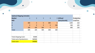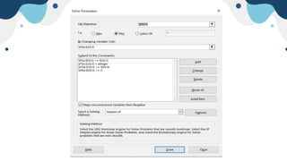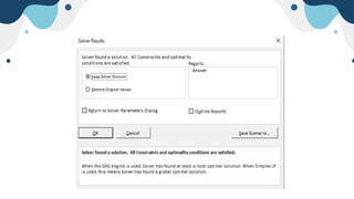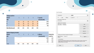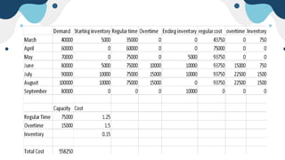 The document describes a linear programming problem to minimize costs for a pipe manufacturing company over 7 months. It provides production capacities, costs, demand forecasts, and inventory holding costs. The assistant formulates the LP with decision variables for regular and overtime production and inventory levels. The objective is to minimize total costs of production, inventory holding and meeting demand over the 7 months. The LP is set up and solved in a spreadsheet, finding the optimal solution that meets all constraints with a total minimum cost of $558,250.