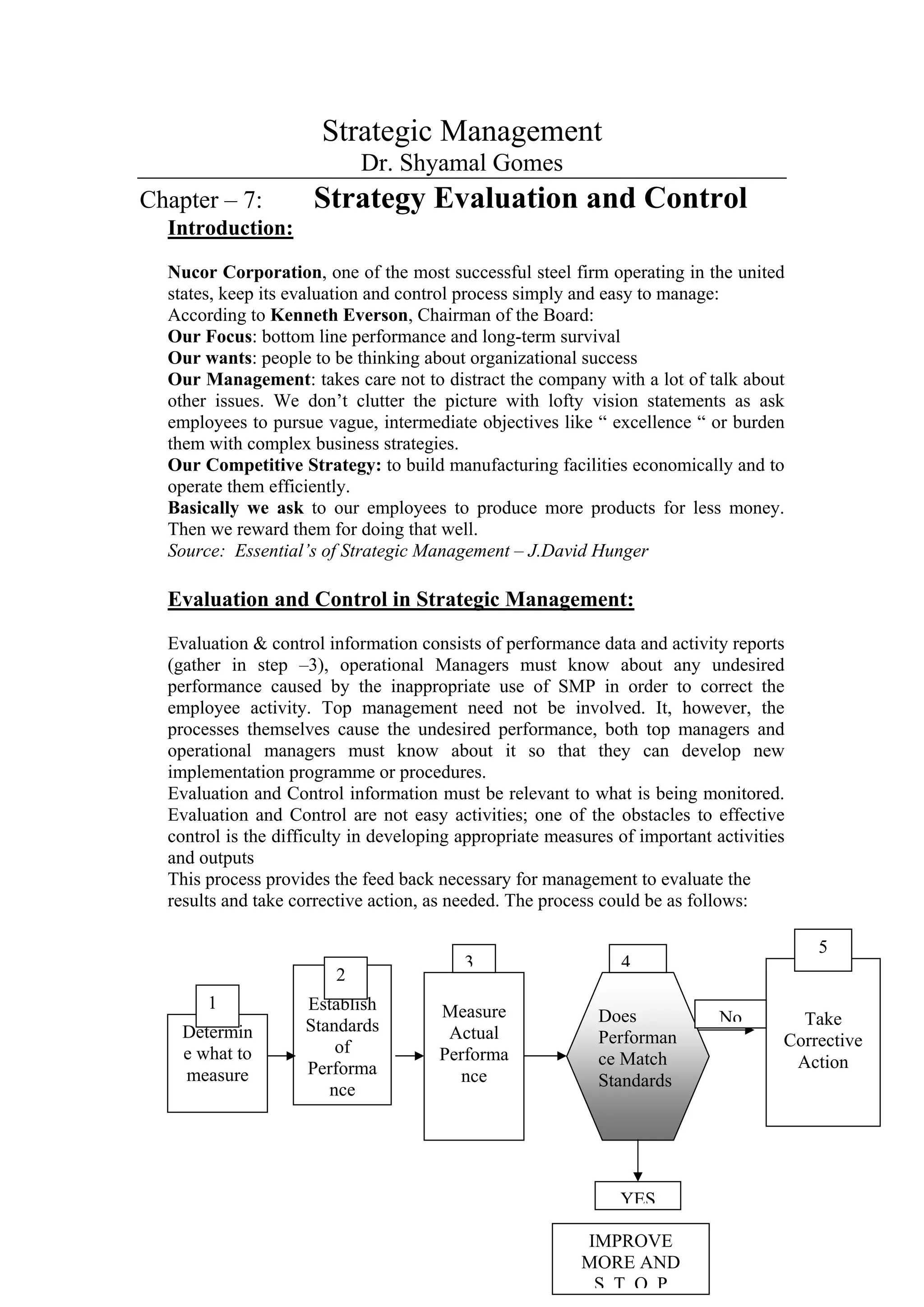 1) Nucor Corporation keeps its strategy evaluation and control process simple, focusing on bottom line performance, long-term survival, and rewarding employees for producing more products at lower costs.
