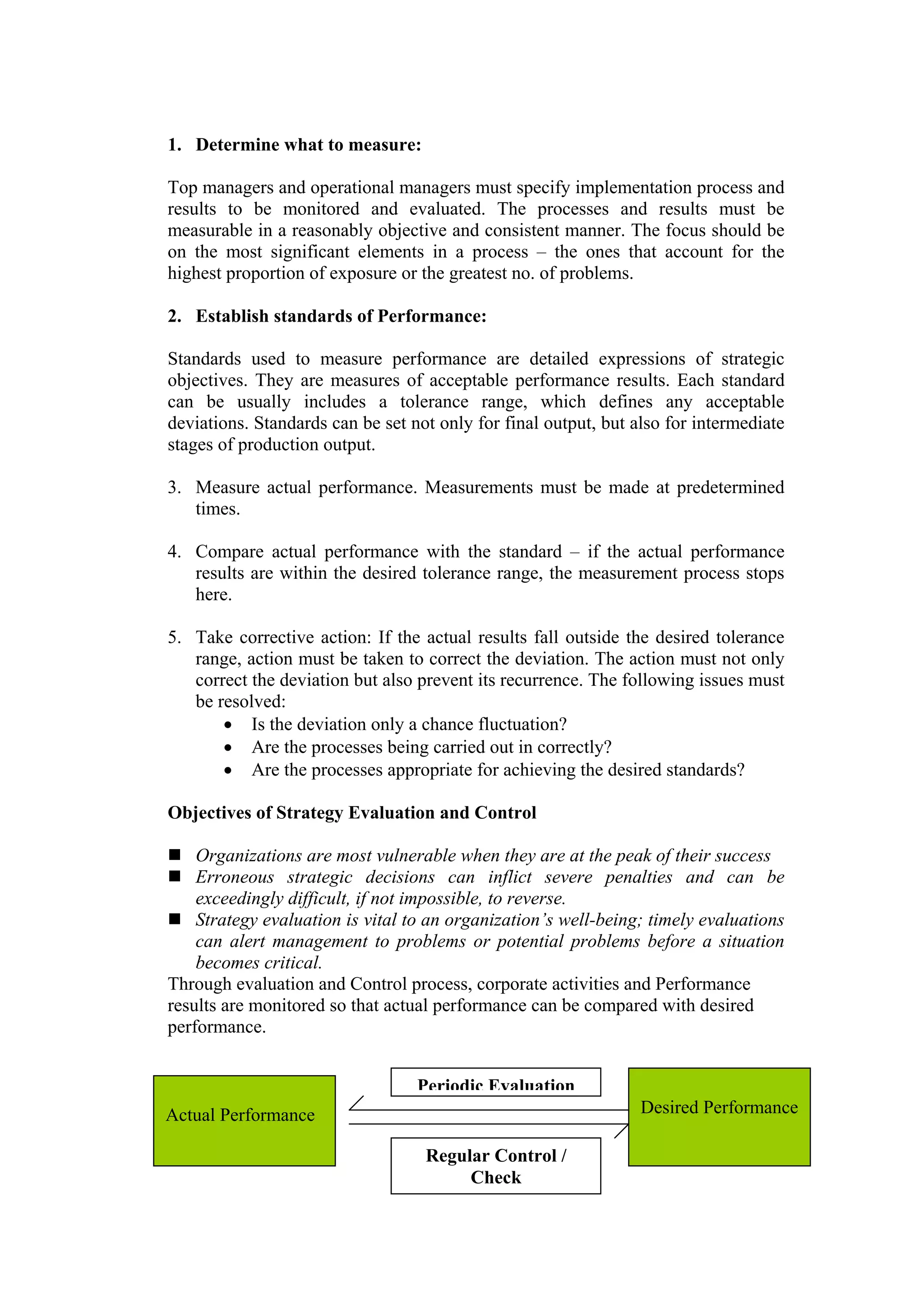 2) Strategy evaluation and control involves measuring actual performance against established standards, and taking corrective actions if deviations occur outside tolerance ranges.