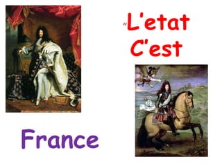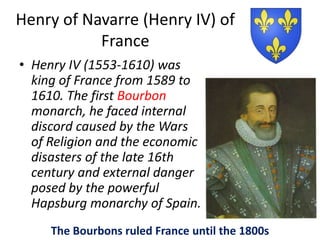 Henry IV of France faced internal religious discord and external threats from Spain in the late 16th century. He issued the Edict of Nantes granting Huguenots religious toleration and repaired France. Louis XIII and Cardinal Richelieu continued centralizing power in the monarchy. Louis XIV ruled France for 72 years and epitomized absolute monarchy, centralizing authority and using the arts to glorify his rule as the "Sun King". He built the palace of Versailles as a symbol of his power.