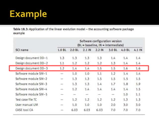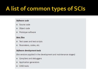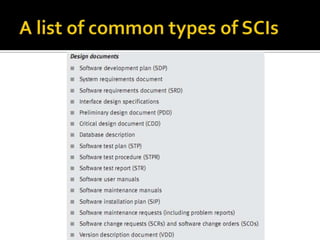 The document discusses software configuration management. It describes version 1.0 and 1.1 of a software engineering document released on February 2, 2012 and June 2, 2012 respectively by author Kittitouch S. Version 1.1 added details on software configuration versions, tools for managing configuration, and a software configuration management plan. The document then discusses software configuration, management, and control as well as accurate versioning. It describes configuration items, versions, and numerating conventions. The summary provides an overview of the key topics and changes covered in the document.