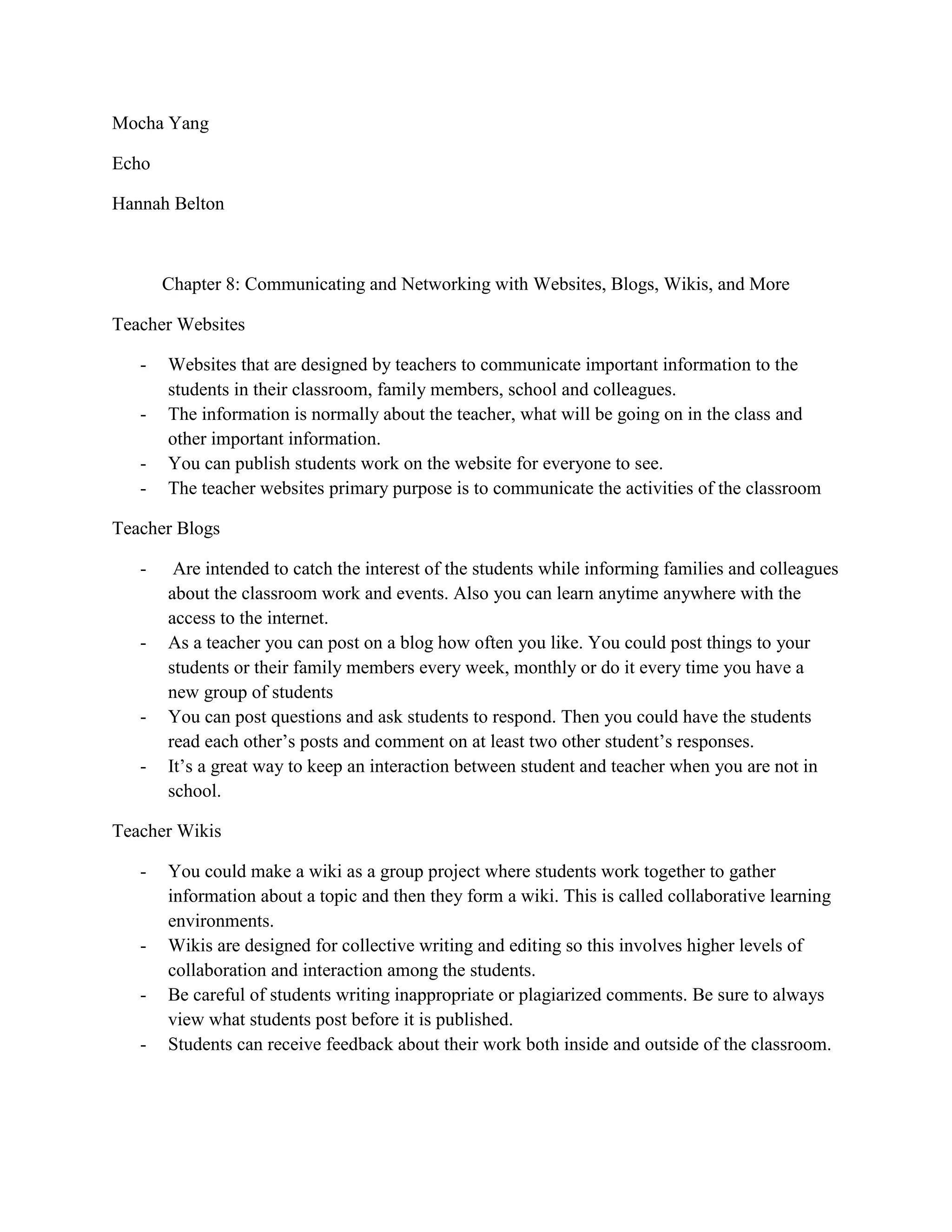 Teacher websites are designed to communicate important information to students, families, and colleagues about what is happening in the classroom. They can publish student work and share classroom activities and events. Teacher blogs allow catching student interest while informing others, and can be posted to weekly, monthly, or for each new student group. Blogs allow interaction between students and teachers outside of school. Teacher wikis can be used for group projects where students collaboratively gather and edit information on a topic to create a wiki, promoting collaboration and interaction. Monitoring of posts is important to prevent inappropriate content.