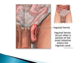 The document summarizes information about the digestive system, including hematochezia, colonoscopy procedures, hernioplasty surgery, and cachexia. It defines hematochezia as the passage of fresh blood in stool, which can be caused by lower or upper gastrointestinal bleeding. Colonoscopy is described as a procedure to examine the colon and rectum using a flexible scope to detect abnormalities. Hernioplasty is surgery to repair hernias using one's own tissue or mesh. Cachexia is defined as a wasting syndrome involving weight loss, muscle atrophy, and loss of appetite seen in conditions like cancer and AIDS.