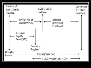 The document discusses methods for estimating a company's working capital requirements. It outlines a four step process: 1) estimating the cash costs of current assets like raw materials, work-in-process, and finished goods inventory, 2) estimating current liabilities like creditors and expenses, 3) calculating net working capital, and 4) adding a contingency percentage. It also describes how to calculate key working capital metrics like operating cycle and cash conversion cycle using formulas involving inventory, accounts receivable, accounts payable, cost of goods sold, and sales figures.