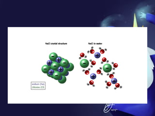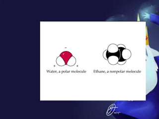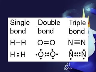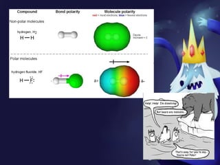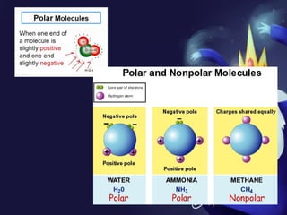 This document discusses covalent bonds and covalent compounds. It explains that covalent bonds form when two atoms share one or more pairs of valence electrons, becoming stable. Water (H2O) is used as an example where the oxygen atom shares electrons with the hydrogen atoms. Compounds can be polar or nonpolar depending on whether electron sharing is equal. Polar molecules like water can dissolve other polar substances like sugar due to electron attraction. Chemical formulas represent the elements and numbers of atoms in compounds.
