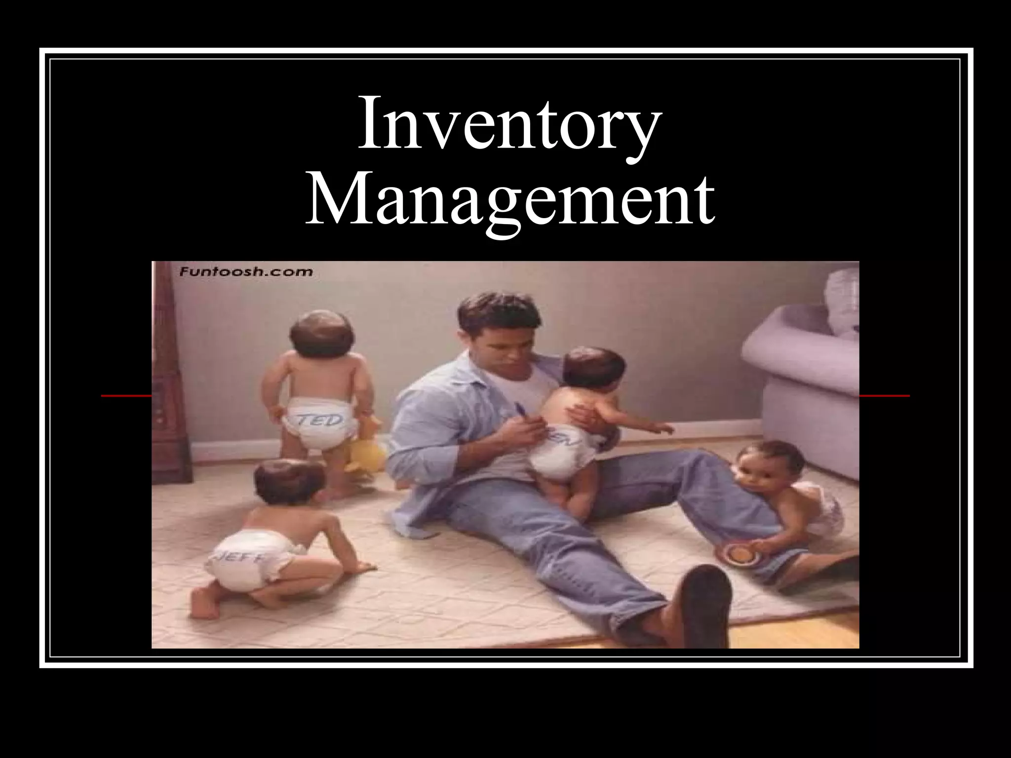 This document discusses inventory management techniques for businesses. It covers the need to balance inventory levels to ensure continuous production while minimizing costs. It describes different inventory control methods like ABC analysis, economic order quantity models, order points, and safety stock. It also lists the various costs of holding too much or too little inventory such as carrying costs, opportunity costs, and risks of price changes or obsolescence.