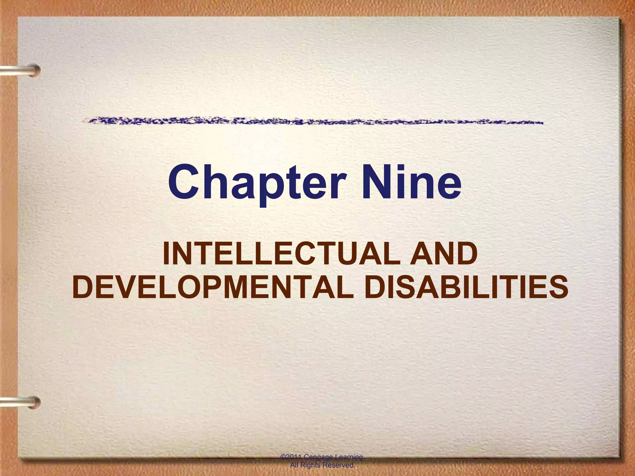 The document discusses intellectual and developmental disabilities. It defines intellectual disability as significant limitations in intellectual functioning and adaptive behavior before age 18. Developmental disability is defined as mental and/or physical impairments limiting substantial functioning in major life activities. Intellectual disabilities are classified as mild, moderate, severe or profound based on IQ scores. Causes can include chromosomal abnormalities, prenatal influences, accidents or diseases. Educational supports focus on life skills and transitioning to adult life and community participation.