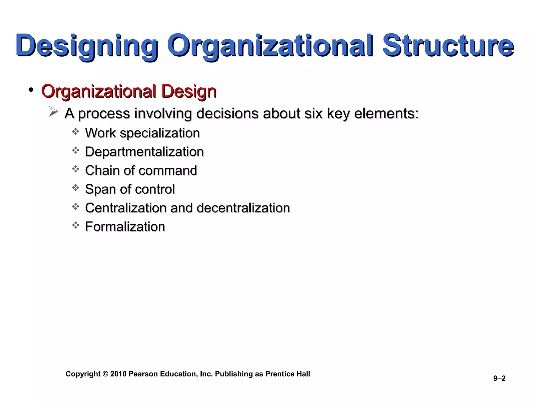 The document discusses organizational structure and design. It covers key elements of organizational design including work specialization, departmentalization, chain of command, span of control, and centralization/decentralization. It also discusses traditional and contemporary organizational designs such as functional, divisional, team, matrix, and boundaryless structures. Additionally, it addresses challenges of designing organizations to keep employees connected, build a learning organization, and manage global structural issues.