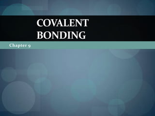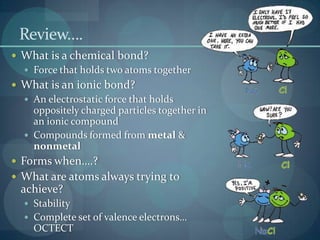 This document discusses different types of chemical bonds including ionic bonds, covalent bonds, and the factors that determine bond strength. It defines ionic bonds as electrostatic attractions between oppositely charged ions, and covalent bonds as the sharing of valence electrons between nonmetals. Bond length and bond energy are inversely related, with shorter, stronger bonds forming from increased orbital overlap and multiple bonds. Lewis structures are used to represent electron arrangements in molecules using dots or lines to indicate bonding and non-bonding electron pairs.